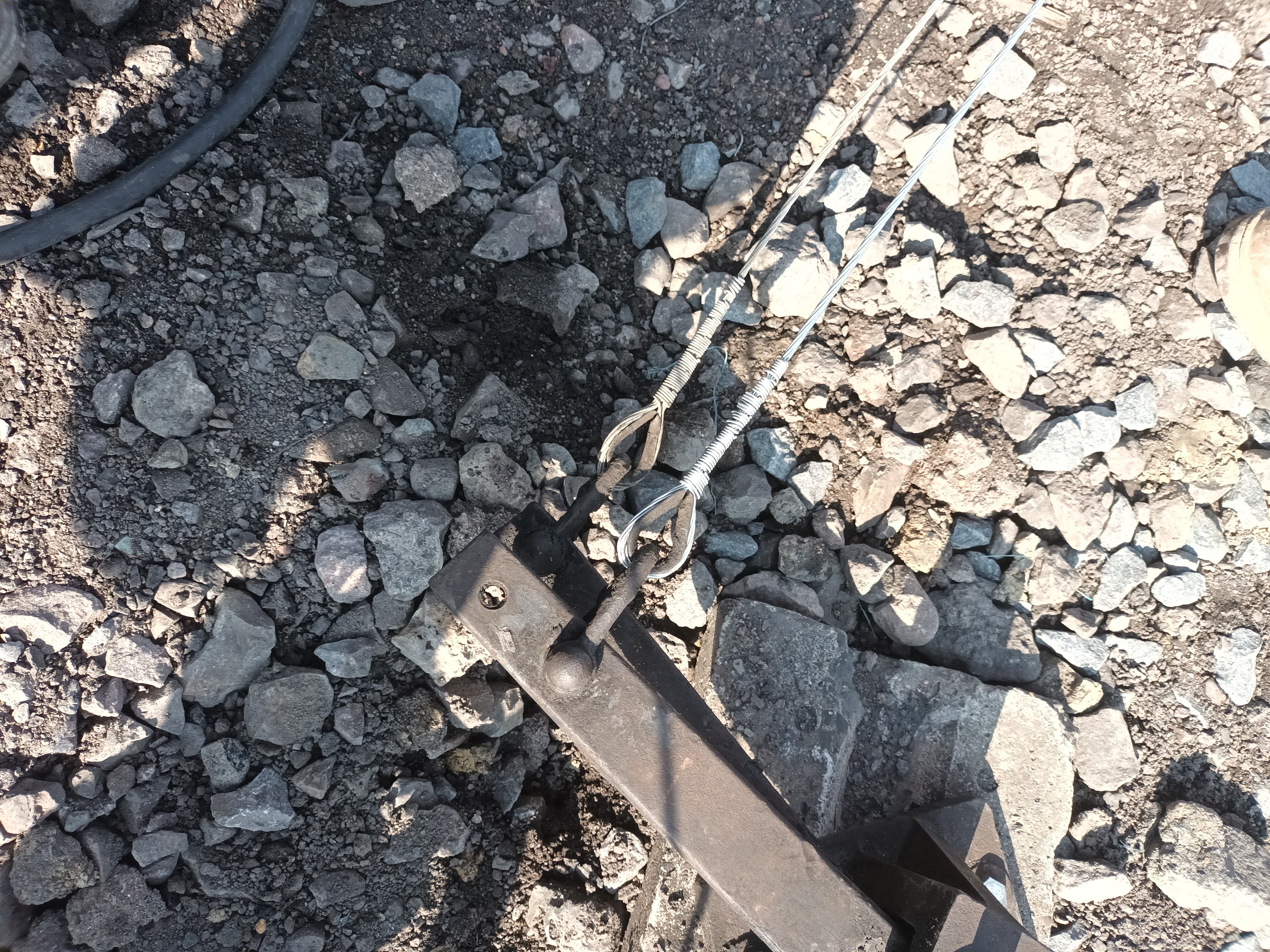 The machine sits on two timbers and is bolted through them. The 'business end' of the machine is bolted through the sole or gauge plate (along with the rail chairs that hold the toes of the point switches) and this ensures that none of those can move relative to the other, thus keeping the toe of the points at the correct gauge and the machine at the same distance from them. The machine is connected to the points by four bars: The first and heaviest is the drive bar, this links the drive stretcher of the points to the drive portion of the machine and this is the first part that we set up. The machine has a throw of about 150mm which is not adjustable, the points would normally have movement of 105mm to 110mm between the two positions. In order to couple these two movements together we use an item called a basket, which is a block through which the drive bar goes. On the Drive Bar, either side of the Basket, is a drive nut and lock nut, these are adjusted tight for each position of the points, allowing the drive bar an amount of free movement before picking up the points and moving them. This is the first job in setting up the machine and is achieved by hand winding the machine between the two positions until the blades have been set correctly. The second bar connects the Lock Stretcher (a bar which connects the toes of both blades together) to the facing point lock within the machine. The purpose of this stretcher and bar is to lock the points safely in one or other of the correct positions and this is the next part that we set up.